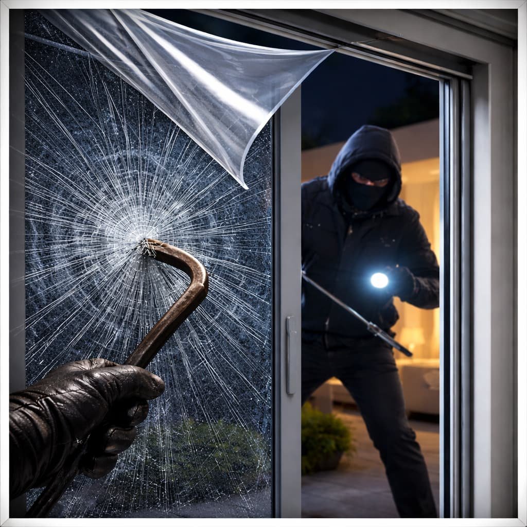 Le film de sécurité transforme votre vitrage en une barrière résistante. Il maintient le verre en place, retarde l’intrusion et complique fortement toute tentative de passage.